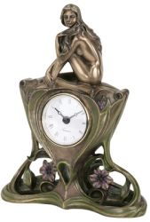 A sensuous art nouveau fairy keeps time for you! Hand-painted resin.