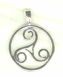 The traditional Triple Spiral bounded by the sacred circle. Represents mother, maid, crone and past, present, future. Pendant is hand-cast in the U.S.A. from premium lead-free pewter and available with precious metal finish. Size: approx. 1-3/8 in. tall.