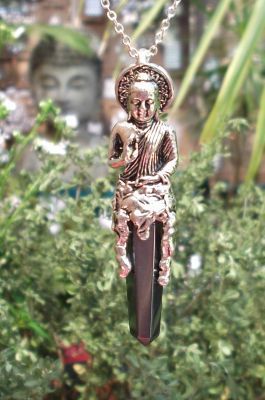 This beautiful version of the Buddha, the Compassionate One, shows Buddha with his hand raised in protection. Antiqued, silver-plated lead-free pewter pendant with polished crystal point. Pendant size approx. 2 3/4 inches tall. Available in your choice of lovely faceted points. Hand cast and individually hand-antiqued in U.S.A. FREE CHAIN INCLUDED! FREE GIFT BOX INCLUDED!!